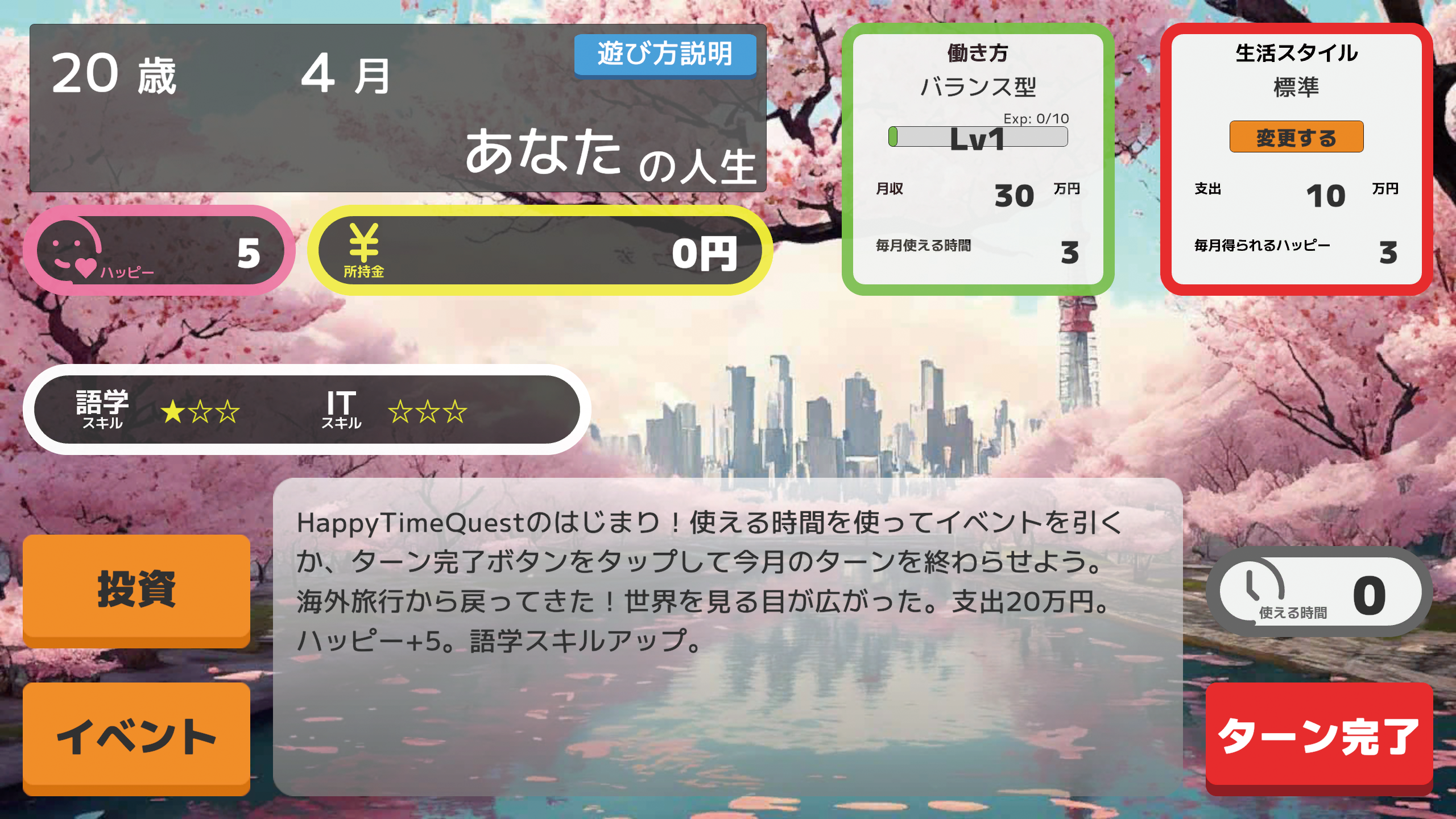 ハッピーをできる限り多く得ることを目指す人生シミュレーションゲームです。